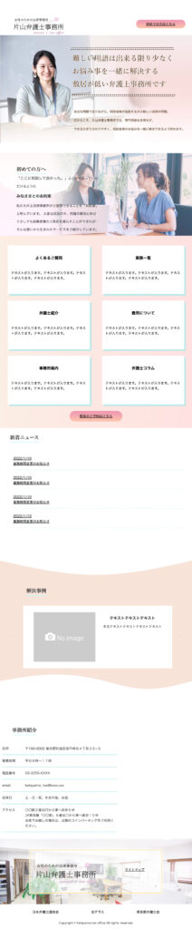 | 概要 | 架空の弁護士事務所のHPを作成。 女性の法律や問題に詳しい弁護士事務所をイメージ。 |